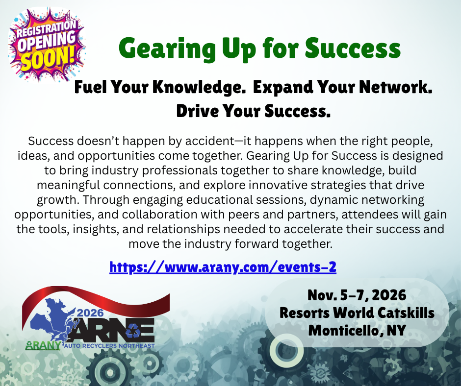 The Automotive Recyclers Association of New York (ARANY) is dedicated to advancing the automotive recycling industry and promoting its significant environmental, economic, and societal benefits. Through statewide leadership, education, and advocacy, ARANY supports its members with superior services, trusted resources, and expert-level professional development opportunities.